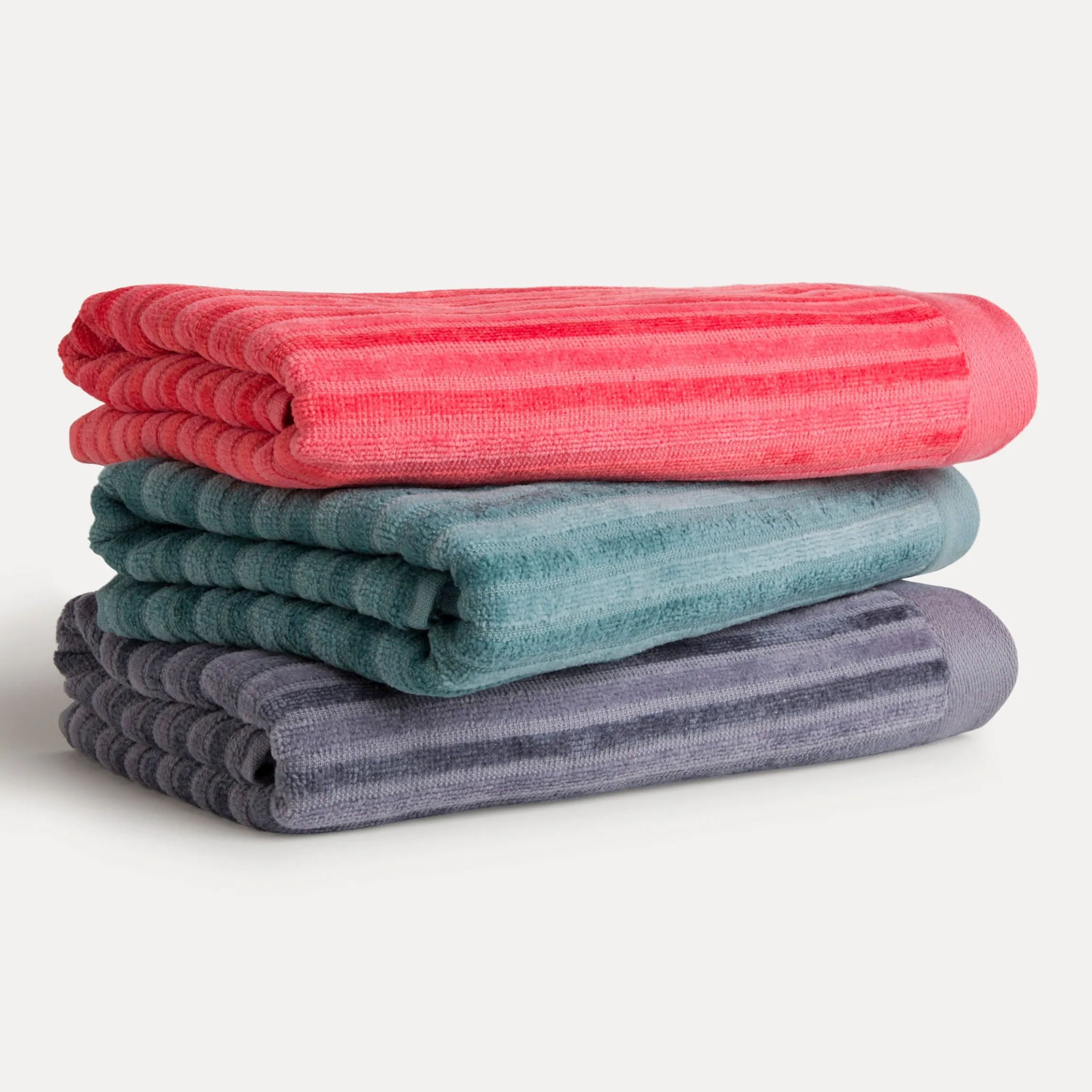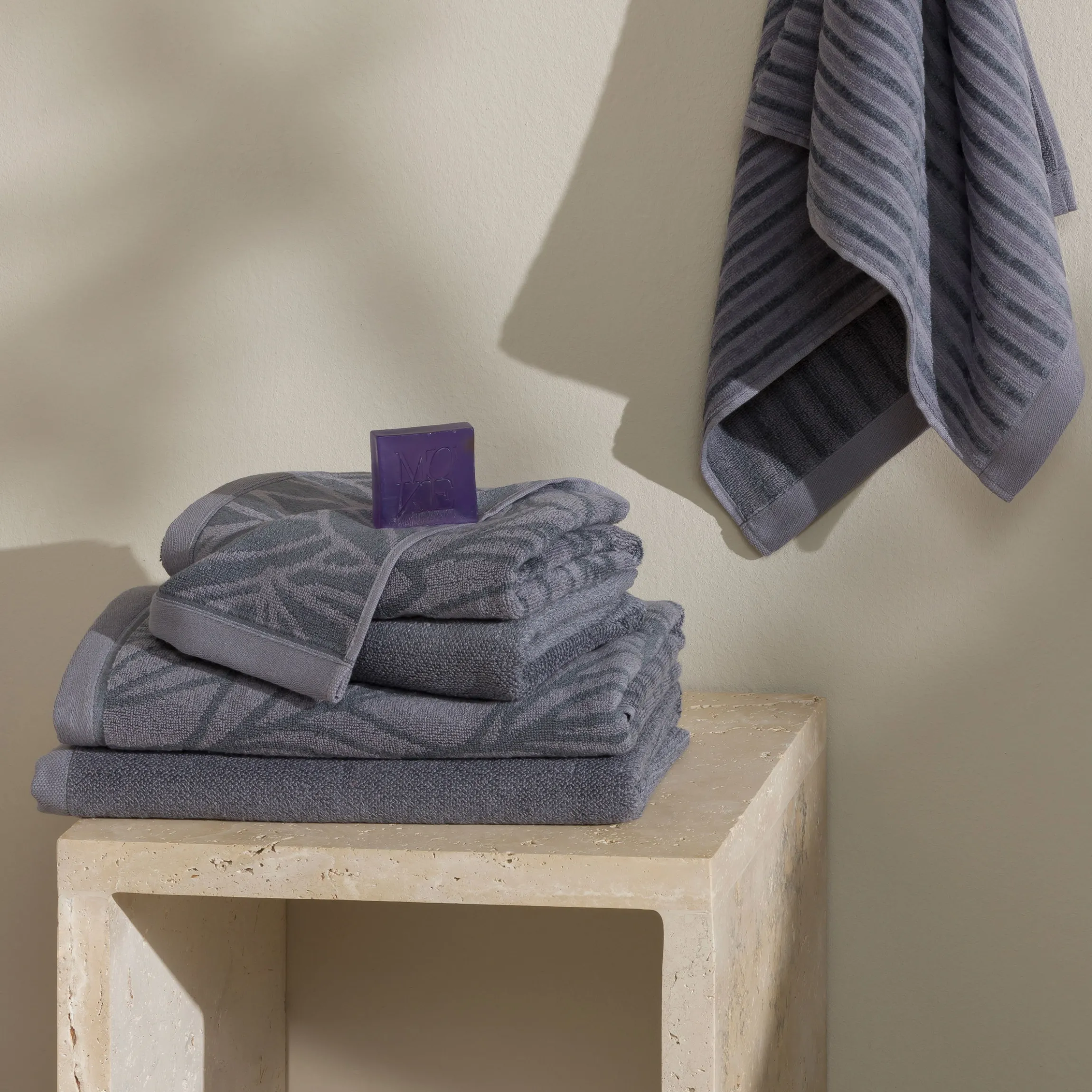 Die Handtücher aus Baumwolle sowie aus Bambus gewonnener Viskose haben eine unglaublich weiche Haptik und schimmern edel. Das monochrome Spiel der Strukturen verleiht Eleganz.