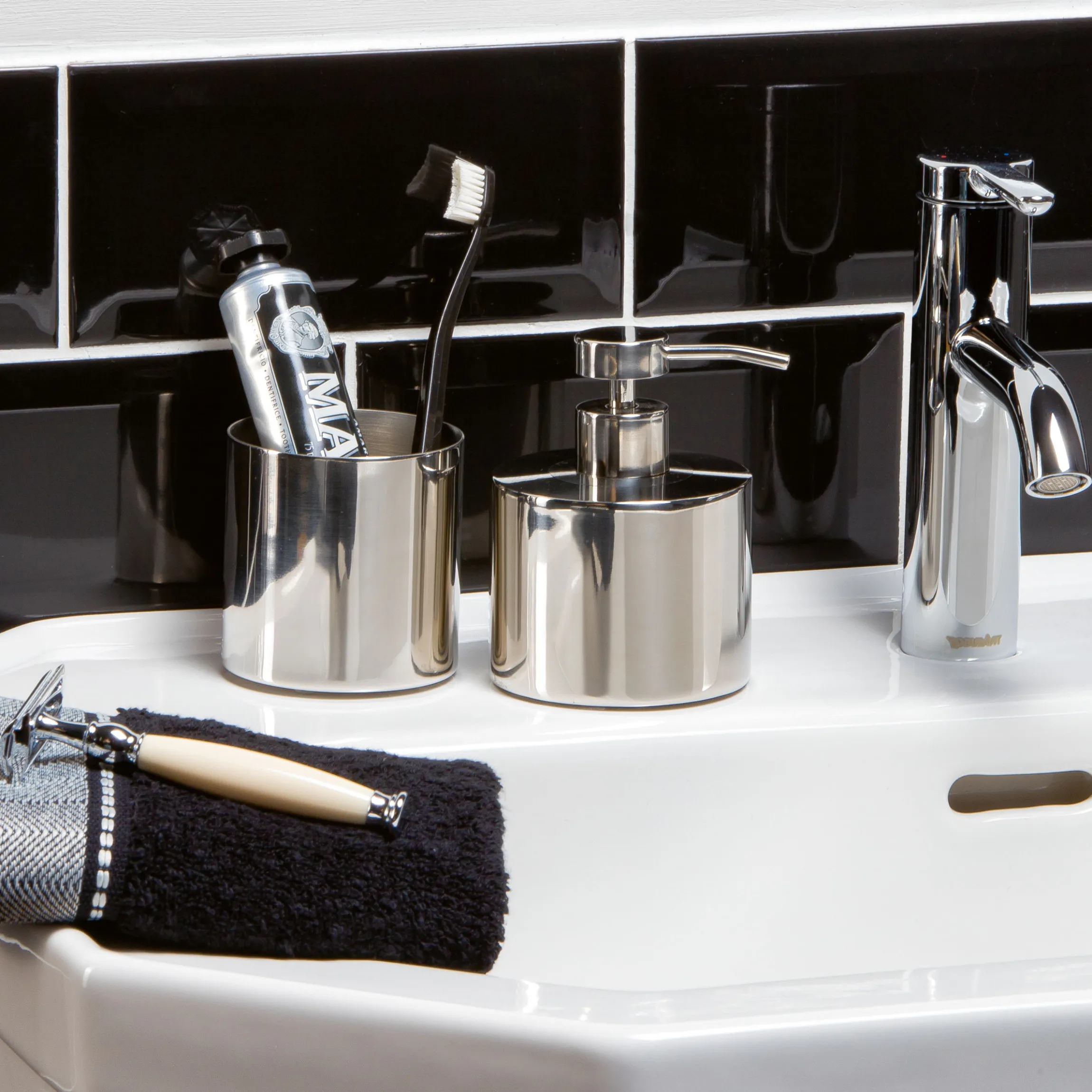 Entdecken Sie die elegante und doch schlichte WC-Garnitur aus der Kollektion möve DECO. Ein auf Hochglanz polierter Behälter und eine Toilettenbürste mit langem Griff aus Edelstahl ergeben ein dekoratives und zugleich funktionales Set. Die leichte Abdeckung aus Kunststoff sorgt dafür, dass die Bürste sicher im Behälter steht und fungiert gleichzeitig als praktischer Sichtschutz. Dank kleiner Gummifüßchen steht die Toilettengarnitur zudem stabil auf dem Boden. Ob alleine oder zusammen mit anderen Artikeln der Kollektion ist diese WC-Garnitur ein echter Hingucker.