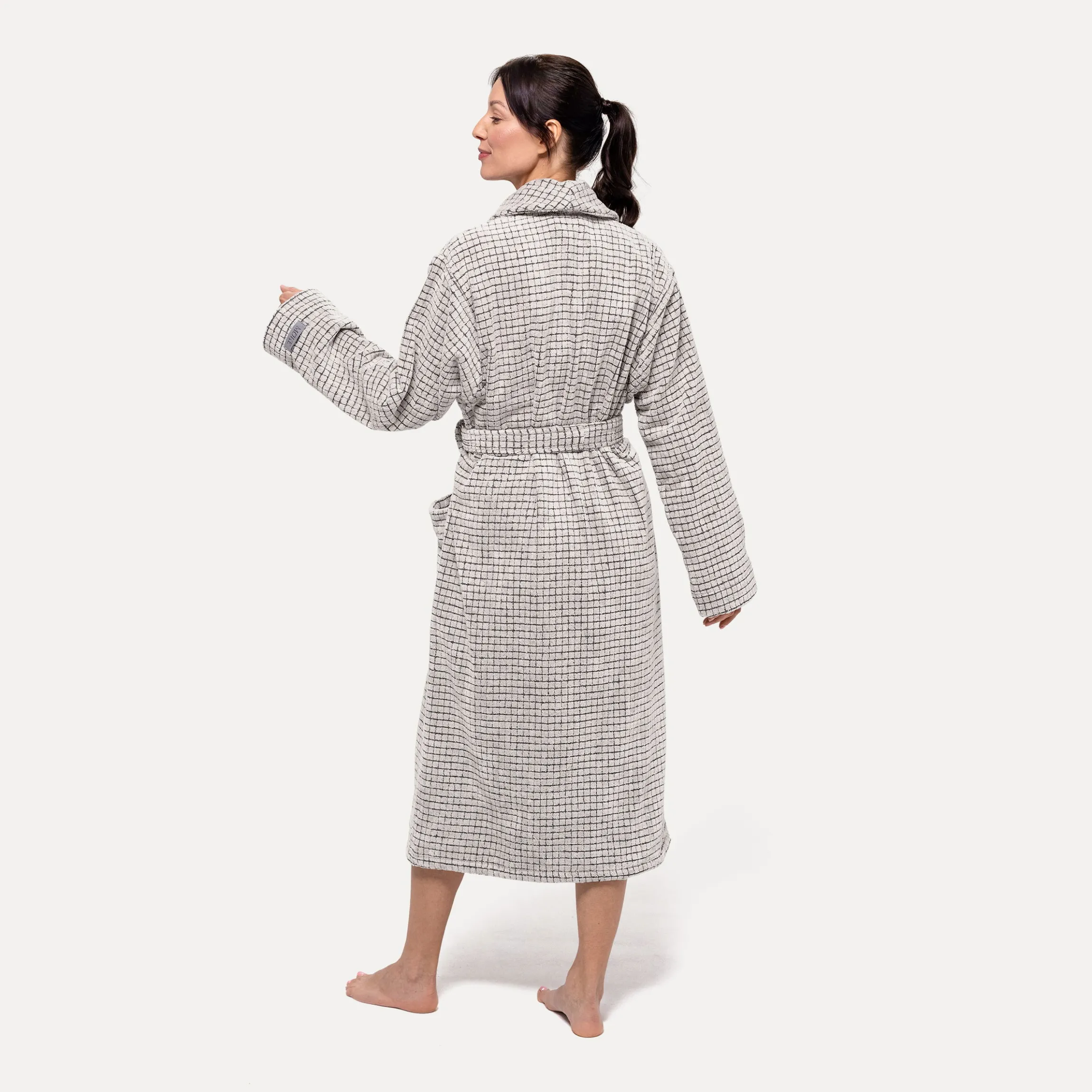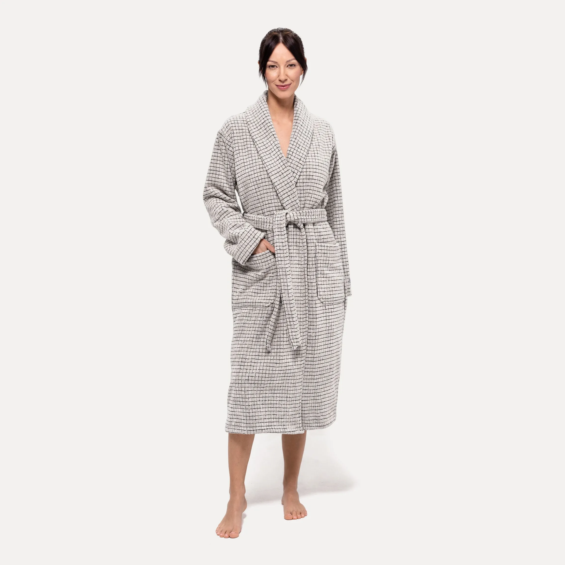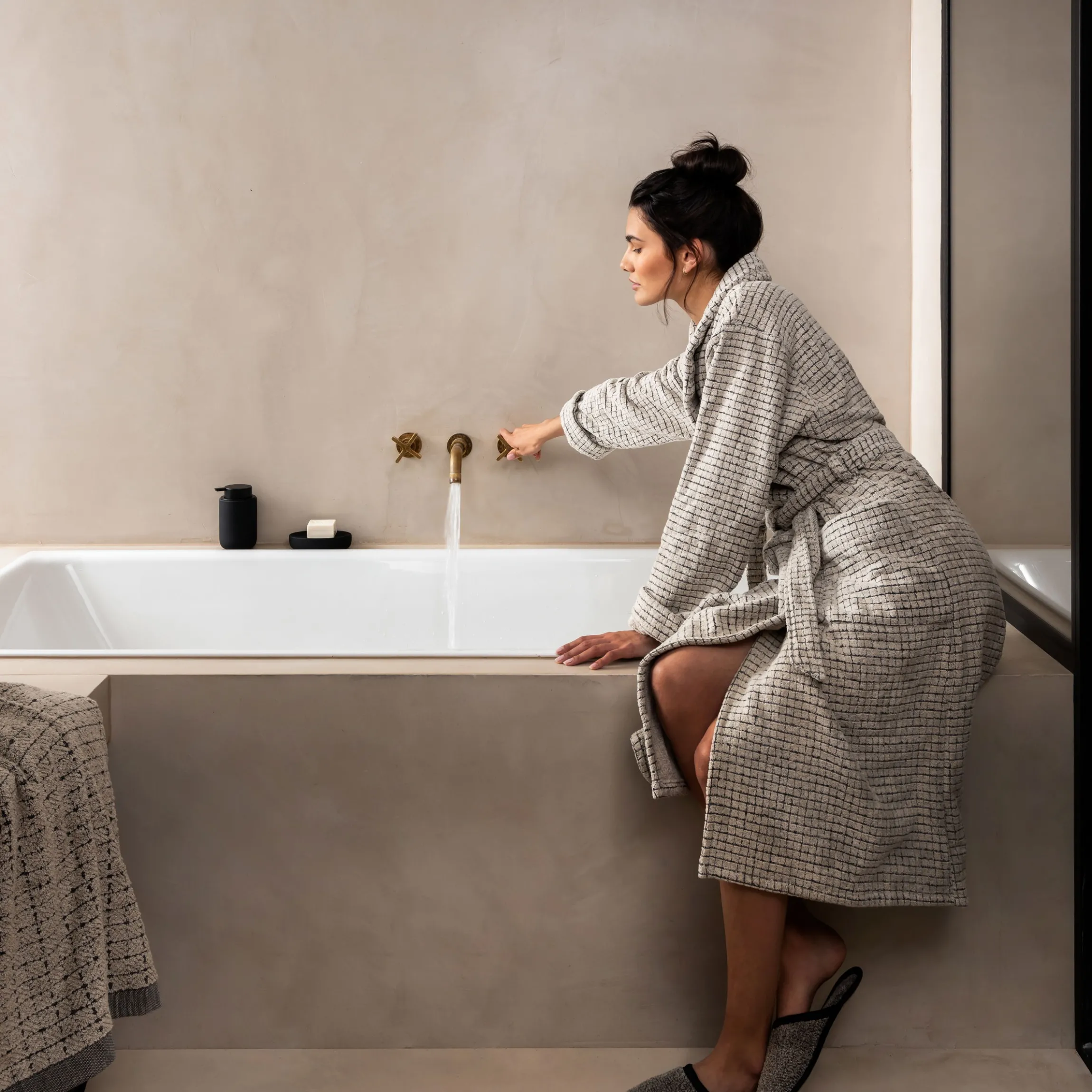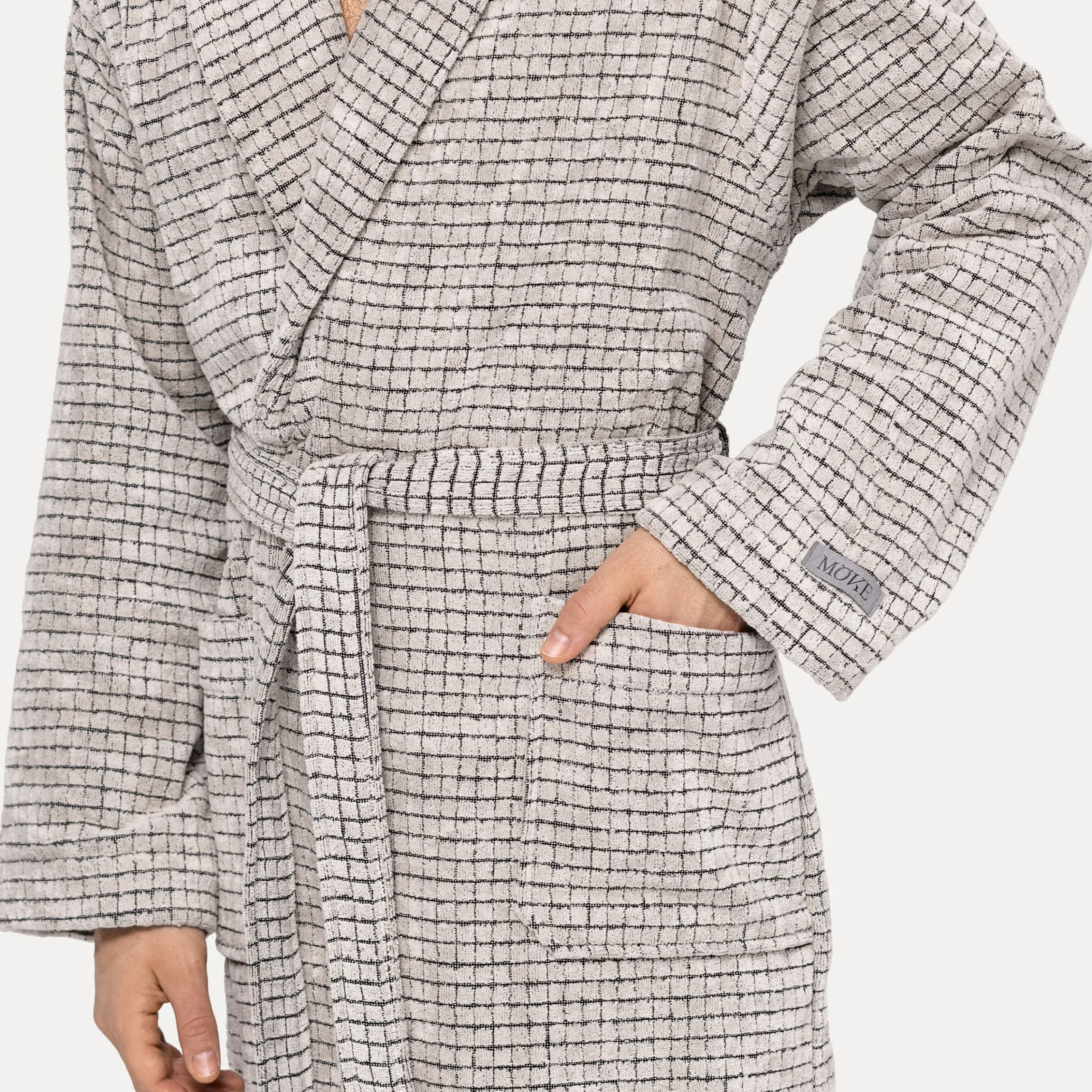 Naturbelassene Baumwolle und schwarzes Leinen machen die Kollektion MÖVE EDEN puristisch und edel zugleich. Der bequeme Schalkragenmantel besticht durch die elegante Kästchenstruktur und fühlt sich dank des weichen Velours besonders angenehm auf der Haut an. So hält er Sie besonders an kühlen Tagen kuschelig-warm. Der Bademantel hat einen matten Glanz und ist in unterschiedlichen Größen erhältlich. Er verfügt über aufgesetzte Taschen und einen praktischen Bindegürtel. So überzeugt er allein oder in Kombination mit anderen Artikeln der zeitlosen Kollektion.